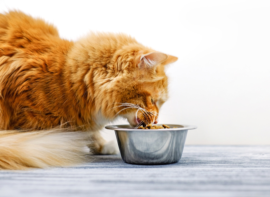 Explains the difference between dry, wet, and raw food, key nutrients cats need, and how to read pet food labels.
